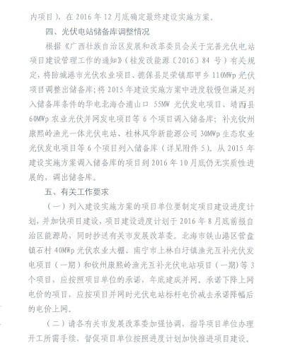 中國儲能網(wǎng)訊:日前,廣西壯族自治區(qū)發(fā)展和改革委員會發(fā)布《關(guān)于調(diào)整2014年、2015年光伏電站建設(shè)實施方案及2016年新增建設(shè)規(guī)模初步安排的通知》(桂發(fā)改能源函[2016]1965號),原文如下: