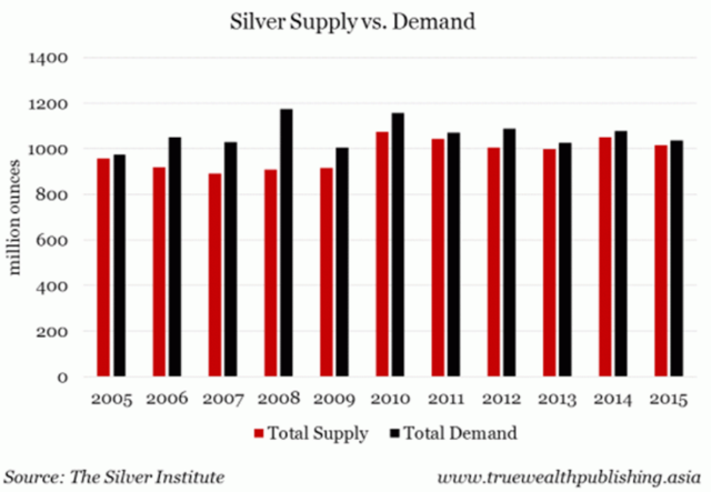 大宗商品研究機構CPM預計,2016年白銀的產量將會下降2.4%。這是數十年來,白銀的產量首次出現下滑。與此同時,CPM預計白銀的需求量會大幅增長。由于許多工業(yè)都需要銀作為原料,比如,太陽能板、電力行業(yè)、珠寶行業(yè)、硬幣等,預計來自這些工業(yè)的需求量在2016年將會上漲1.6%。