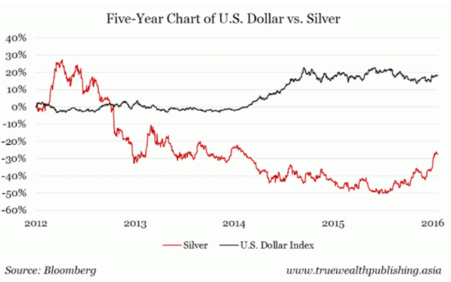 和許多其它大宗商品一樣,白銀也是用美元定價的。因此當美元升值的時候,白銀的價格就會下跌。這時候同樣的美元可以買到更多的白銀。當美元貶值的時候,同樣的美元買到的白銀數量就會減少,白銀的價格就會上升。從下圖中,你可以清楚地看到過去5年間白銀價格與美元走勢的分離。這意味著,美元升值的時候,白銀價格就會下降,反之亦然。