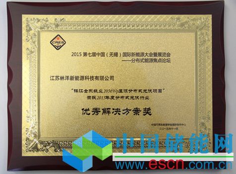 林洋電子一直致力于成為東部分布式能源、能效管理領(lǐng)域的互聯(lián)運營服務(wù)商,在分布式光伏電站建設(shè)、運營及運維方面始終走在行業(yè)前列。在該論壇舉行的“2015年度分布式光伏行業(yè)優(yōu)秀解決方案”評選活動中,林洋新能源脫穎而出,其“金東紙業(yè)20MW屋頂分布式光伏項目”榮獲該獎項。