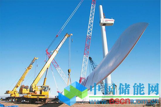 在河北省張家口壩上地區(qū),兩臺(tái)吊車正在合力吊裝巨大的風(fēng)機(jī)風(fēng)葉