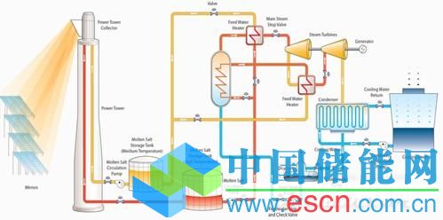 溶鹽吸熱之后會首先經(jīng)過第三部分儲存系統(tǒng)(storage system),溶鹽的儲存性能是最好的,儲存一周以上也只有微小的溫度下降,這是用它做介質(zhì)的原因之一。一般儲存系統(tǒng)會保證電廠晚間繼續(xù)發(fā)電,但是遇到陰天下雨的日間也會工作。儲存系統(tǒng)非常重要,因?yàn)榭梢韵鳒p發(fā)電成本,新能源發(fā)電是燒錢的,現(xiàn)在成本也沒有降下來,還是靠國家補(bǔ)貼。