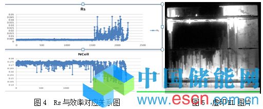 4.通過效率測試程序卡控Rs來監(jiān)控印刷異常:Rs主要包含四部分,硅片的體電阻,薄層電阻,金屬電極電阻,歐姆接觸電阻。正常多晶電池片的Rs值在2.50毫歐姆左右,可以在程序中設(shè)置將Rs大于一定值(建議3.5毫歐姆)的分選到某個檔位,這樣通過對該檔位的比例監(jiān)控即可快速預(yù)警虛印等異常問題。Rs偏大通常有以下表現(xiàn)情況:1.若發(fā)現(xiàn)某個時間段開始,整體偏大或間斷性出現(xiàn)Rs偏大,很可能是因為印刷效果不好造成柵線和硅片沒有形成合金層,有空隙導(dǎo)致歐姆接觸不好。2.伴隨開路電壓和短路電流偏低的Rs偏大,可能為燒結(jié)原因造成,而伴隨開路電壓和短路電流偏高的Rs偏大,可能為方塊電阻偏高。一般前制程比較穩(wěn)定,若某段時間連續(xù)出現(xiàn)Rs偏高的一般均為EL虛印造成,圖4和5顯示了一段時間Rs偏高,效率下降,測試對應(yīng)電池片EL圖片虛印嚴(yán)重。