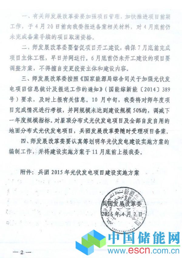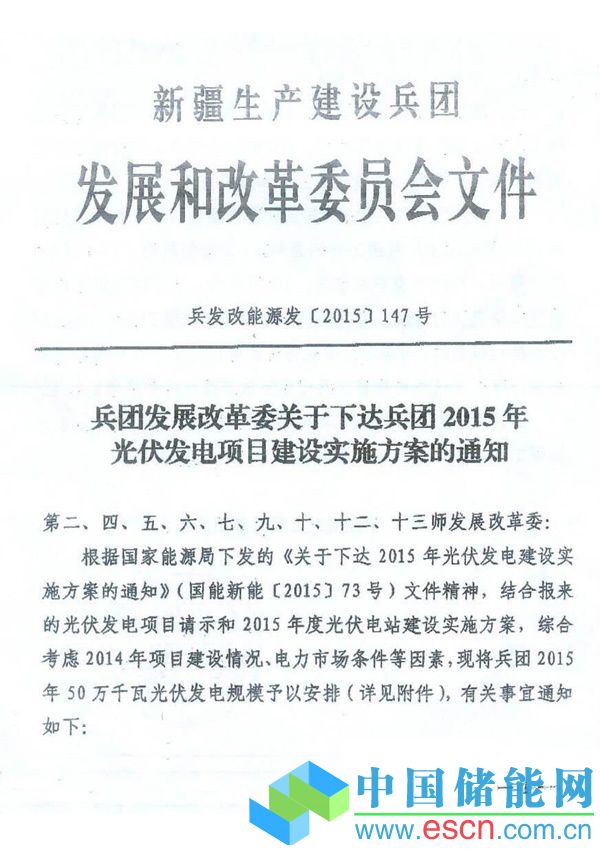 2015年4月7日,新疆生產(chǎn)建設(shè)兵團(tuán)發(fā)展和改革委員會(huì)向第二、四、五、六、七、九、十、十二、十三師發(fā)改委下發(fā)《兵團(tuán)發(fā)改委關(guān)于下達(dá)兵團(tuán)2015年光伏發(fā)電項(xiàng)目建設(shè)實(shí)施方案的通知》兵發(fā)改能源發(fā)【2015】147號(hào)文件。