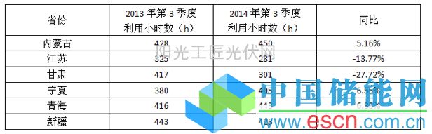 江蘇和新疆 2014 年第三季度陰雨天氣較去年同期多,直接影響了光伏電站的發(fā)電量,造成利用小時數(shù)同比降低。