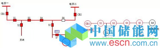 上圖中的拓撲結(jié)構(gòu),兩邊有電源,并網(wǎng)開關(guān)里有終端。終端帶電后就開始識別拓撲結(jié)構(gòu),進行查詢,查詢哪個開關(guān)是合的,哪個開關(guān)是斷的,查詢到斷的就停止,通過查詢,獲得終端和電源之間的拓撲關(guān)系。