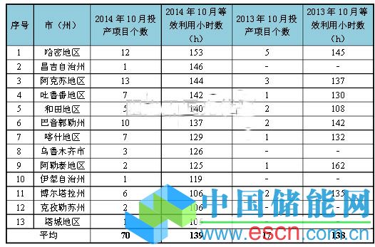 表12013、2014年10月新疆自治區(qū)各市(州)利用小時(shí)數(shù)統(tǒng)計(jì)表