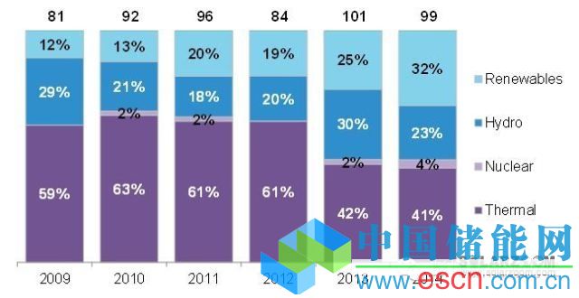 中國電力市場:新增裝機(jī)量 2009-14(預(yù)計(jì))(吉瓦,%)