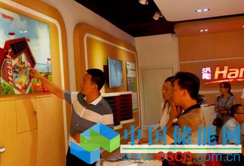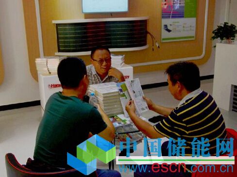 在漢能南通清潔能源展示中心內(nèi),銷售人員向顧客介紹漢能戶用薄膜發(fā)電解決方案