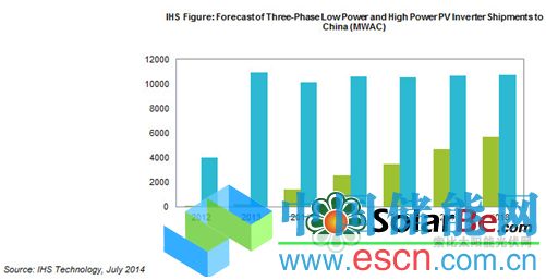 下圖為IHS預(yù)測(cè)的中國(guó)市場(chǎng)的三相小功率逆變器和大功率光伏逆變器出貨量。