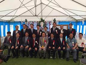 圖片說明:正信董事長王桂奮(前排左四)、總裁王迎春(后排左四)與中國駐日本大使館參贊潘昊(前排右三),日本前首相鳩山由紀夫(前排左五),日本國會議員高邑勉(后排左三),中國江蘇省中小企業(yè)日本代表處首席代表涂家飛(前排右一)及其他出席電站開工儀式的嘉賓合影。