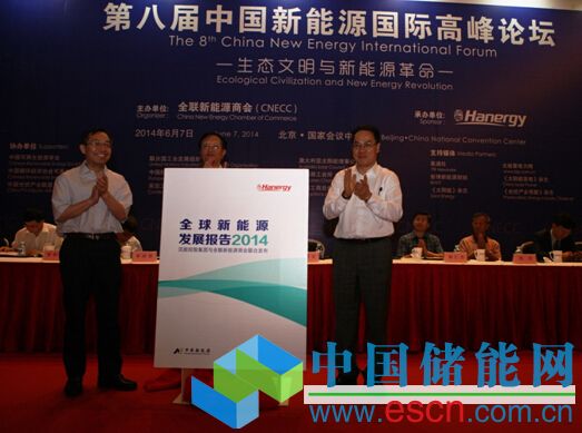 黃小祥(左一)、張國(guó)寶(左二)、李河君(右一)共同為《全球新能源發(fā)展報(bào)告2014》揭幕