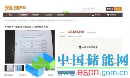 昨日,淘寶拍賣會頁面顯示,*ST超日(2.07, -0.10, -4.61%)旗下一筆資產已拍出。旗下青海錦國興新能源60%的股份拍出2055萬元,僅為投資額三成 拍賣所得將用于支付一筆貨款