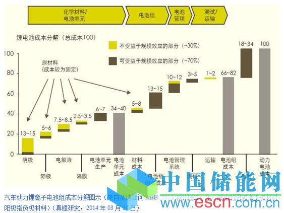 吳輝認(rèn)為,如果以整個汽車動力鋰離子電池組成本為100%來看,電池單元成本占到整個電池組成本的34%~40%,其中6%~7%的電池單元生產(chǎn)成本是可以通過擴(kuò)大生產(chǎn)規(guī)模來降低的,剩余的材料成本則比較固定,降低成本的余地不大。在電池到電池組的過程中,電池組裝、電池管理系統(tǒng)、電池組測試乃至組裝材料等的成本均有下降的空間,尤其前兩者的成本下降空間較大。另外,由于前期的研發(fā)投入要分?jǐn)偟诫姵氐膬r格中,因此電池組的毛利目前還相對偏高,在18%~34%,這一部分的成本也有很大的下降空間。