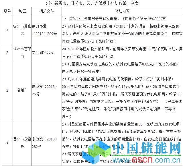 繼國(guó)家和浙江省內(nèi)出臺(tái)相應(yīng)光伏發(fā)電補(bǔ)貼政策后,各市縣政府、發(fā)改部門按照國(guó)家和浙江省政府部署,迅速行動(dòng),認(rèn)真編制光伏發(fā)電規(guī)劃,出臺(tái)鼓勵(lì)政策制定。目前,嘉興、溫州、衢州等市,秀洲、蕭山、海寧、龍游、江山等縣(市、區(qū))克服地方財(cái)政困難,已率先出臺(tái)地方光伏發(fā)電支持政策;臺(tái)州、寧波、杭州等地區(qū)正在積極制定相關(guān)政策,地方政策的出臺(tái)將有效帶動(dòng)地方光伏發(fā)電推廣應(yīng)用,有效促進(jìn)浙江省光伏產(chǎn)業(yè)健康發(fā)展。各市、縣(市、區(qū))光伏發(fā)電補(bǔ)助政策附后。