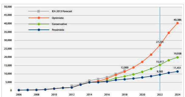 在太陽能輻照資源甚好的南非、南美、亞洲部分地區(qū)和中東及北非地區(qū),當(dāng)?shù)卣诰凸鉄岚l(fā)電項(xiàng)目展開計(jì)劃和推進(jìn)具體項(xiàng)目的招標(biāo)進(jìn)程。據(jù)CSPToday 2013年7月所作的市場調(diào)研結(jié)果,光熱發(fā)電的項(xiàng)目開發(fā)商、咨詢公司、政府機(jī)構(gòu)、裝備供應(yīng)商、EPC商等CSP行業(yè)的企業(yè)的大部分營收依然來自于美國和西班牙市場,這表明當(dāng)前新興市場仍處于前期項(xiàng)目規(guī)劃階段,還未能大范圍實(shí)現(xiàn)營收。而根據(jù)其對243名業(yè)內(nèi)專家的調(diào)研顯示,未來十年,CSP企業(yè)的營收將越來越多的地來自中國、南非、沙特、阿聯(lián)酋、智利、印度等新興市場和美國市場。這背后伴隨的是新興市場的裝機(jī)大幅增加,據(jù)CSPToday的預(yù)計(jì),到2024年,新興市場的光熱發(fā)電裝機(jī)將可以達(dá)到11.5GW~40GW(悲觀情景預(yù)測:11.5GW;中立情景預(yù)測:19.9GW;樂觀情景預(yù)測:40.4GW)之間,年均同比增長達(dá)到12%~26%,呈現(xiàn)巨大增長。