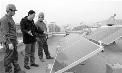 圖為徐鵬飛與青島供電局技術(shù)工人探討家庭光伏電站運(yùn)行情況。 鄭 路攝