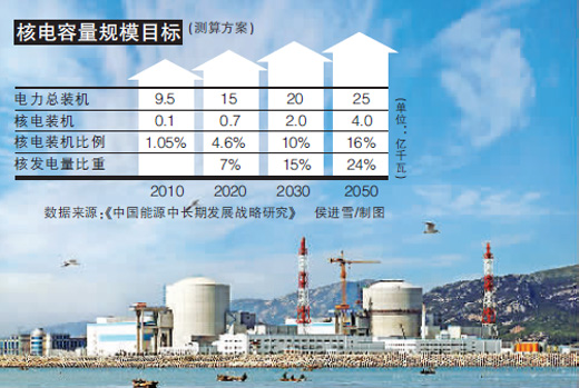 研究結(jié)論指出,我國加速發(fā)展核電是必要的、迫切的。2020年核電總裝機(jī)規(guī)模達(dá)到7000萬千瓦的目標(biāo)是可能實現(xiàn)的;2050年,核電總裝機(jī)容量達(dá)到4億千瓦,核電成為電力工業(yè)的主流之一。核電發(fā)電量占總發(fā)電量的比重為24%,核電裝機(jī)容量占總裝機(jī)容量的16%。