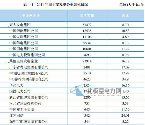 《報(bào)告》還預(yù)測(cè),2012年全國(guó)新增發(fā)電約9000萬(wàn)千瓦,年底裝機(jī)總量將突破11億千瓦。全年全社會(huì)用電量5.1-5.15萬(wàn)億千瓦時(shí),最高用電負(fù)荷6.8億千瓦。以下是2011年底主要發(fā)電企業(yè)裝機(jī)情況一覽: