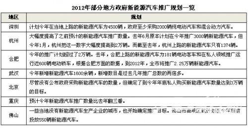 2012年,國家已經(jīng)出臺(tái)的推廣節(jié)能和新能源汽車的鼓勵(lì)政策主要有三項(xiàng),一是開展節(jié)能與新能源汽車示范推廣試點(diǎn)。二是在5個(gè)試點(diǎn)城市開展私人購買新能源汽車補(bǔ)貼試點(diǎn)。三是對(duì)消費(fèi)者購買“節(jié)能產(chǎn)品惠民工程”節(jié)能汽車給予一次性定額補(bǔ)助。