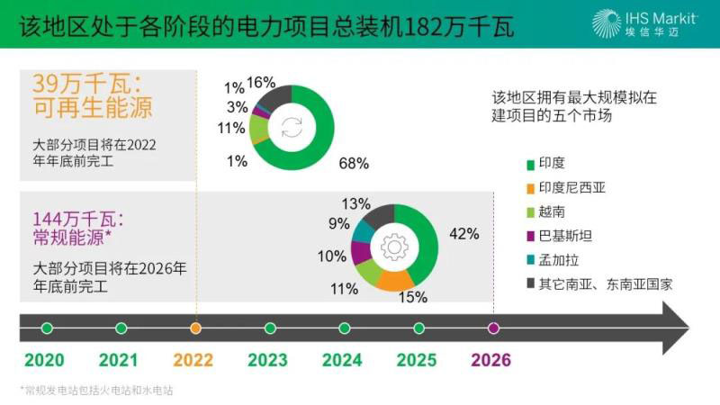 2020年初,埃信華邁(IHS Markit)南亞和東南亞電力團(tuán)隊(duì)考察了各個(gè)電力市場(chǎng),并指出了該地區(qū)最為值得關(guān)注的問題。這些市場(chǎng)的電力需求依然增長(zhǎng)旺盛,因此需要在國(guó)家層面或地區(qū)層面增加裝機(jī),以避免電力短缺。目前,處于各階段的擬在建電力項(xiàng)目總裝機(jī)為182萬(wàn)千瓦 ,其中有39萬(wàn)千瓦可再生能源發(fā)電容量將于2022年裝機(jī)完成,其余144萬(wàn)千瓦常規(guī)電力項(xiàng)目則定于2026年年底前陸續(xù)完工。