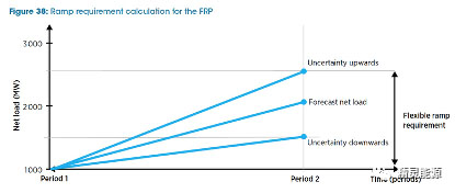 最后一個組成部分,在某些電力系統(tǒng)的備用需求當中,顯示了電力需求和VRE曲線中的預(yù)測誤差。下圖顯示了在給定凈荷載曲線及其預(yù)測不確定性時,F(xiàn)RP的斜坡要求。