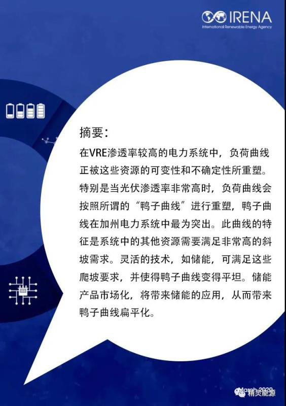 在VRE滲透率較高的電力系統(tǒng)中,負荷曲線正被這些資源的可變性和不確定性所重塑。特別是當光伏滲透率非常高時,負荷曲線會按照所謂的“鴨子曲線”進行重塑,鴨子曲線在加州電力系統(tǒng)中最為突出。此曲線的特征是系統(tǒng)中的其他設(shè)備需要滿足非常高的爬坡需求。靈活的技術(shù),如儲能,可滿足這些爬坡的要求,并使得鴨子曲線變得平坦。儲能產(chǎn)品市場化,將帶來儲能的應(yīng)用,從而帶來鴨子曲線扁平化。