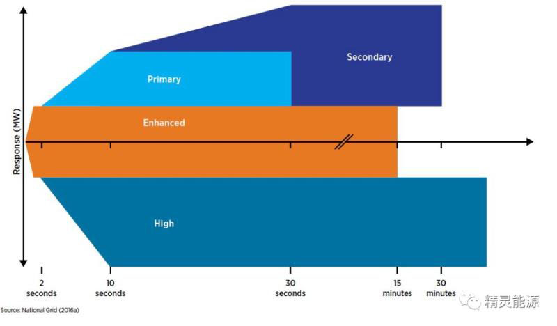 在這方面,英聯(lián)邦的系統(tǒng)運(yùn)營商國家電網(wǎng)開發(fā)了EFR相關(guān)產(chǎn)品,也可定義為一種動(dòng)態(tài)服務(wù),這種EFR產(chǎn)品的功率可隨著系統(tǒng)頻率的變化而成比例地變化。EFR服務(wù)是專門為能量存儲(chǔ)而創(chuàng)建的,一旦頻率超過閾值(可以是“0.05赫茲”(服務(wù)1,寬帶)或“0.015赫茲”(服務(wù)2,窄帶),則需要在1秒內(nèi)作出響應(yīng)。
