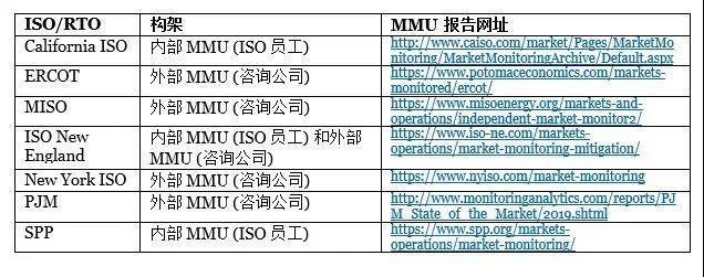 每個ISO / RTO的詳細市場和運營規(guī)則均需獲得FERC的批準[12],其中包括確保MMU具有獨立地位的陳述。有幾個ISO / RTO(作為FERC批準的市場監(jiān)測計劃的一部分)將獨立監(jiān)測功能外包給具有專業(yè)經驗的咨詢公司[13]。參見表1。如果獨立的MMU由ISOs / RTO的員工(而非咨詢公司員工)組成,則被稱為“內部獨立市場監(jiān)測部門” [14]。但是,ISOs / RTO的管理層不能控制或者對其施加權力。例如,在稱為SPP(西南電力庫)的ISO / RTO中有一個內部MMU,經FERC批準的管理規(guī)則規(guī)定:“應授予市場監(jiān)測機構完全的獨立性,以開展為提供公正和有效市場監(jiān)測所需的活動。”[15] 此外,根據(jù)SPP規(guī)則,“市場監(jiān)測機構在制定和完成報告時應具有完全的獨立性,任何個人或實體都不得篩選、更改、刪除或延遲市場監(jiān)測機構的發(fā)現(xiàn)、結論和建議?!盵16]