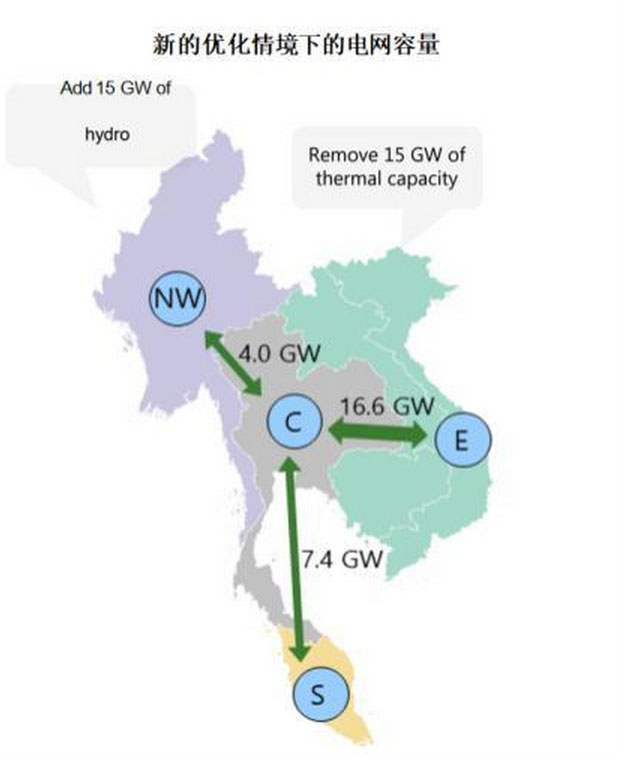 優(yōu)化情景下,協(xié)調(diào)電力系統(tǒng)規(guī)劃,可以進一步提升互聯(lián)線路的效益,降低運行成本、減少碳排放。西北區(qū)域水電資源豐富,足夠滿足本地電力需求,通過增容電網(wǎng)輸電將給整個東盟帶來更多的經(jīng)濟、環(huán)境效益。