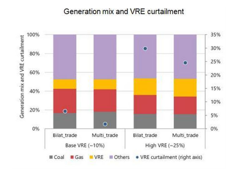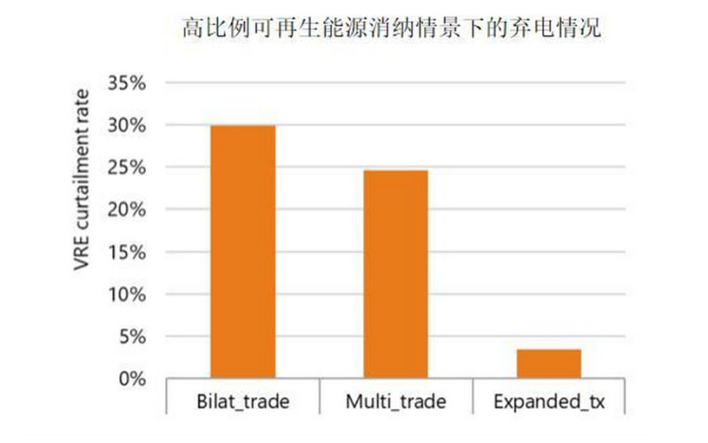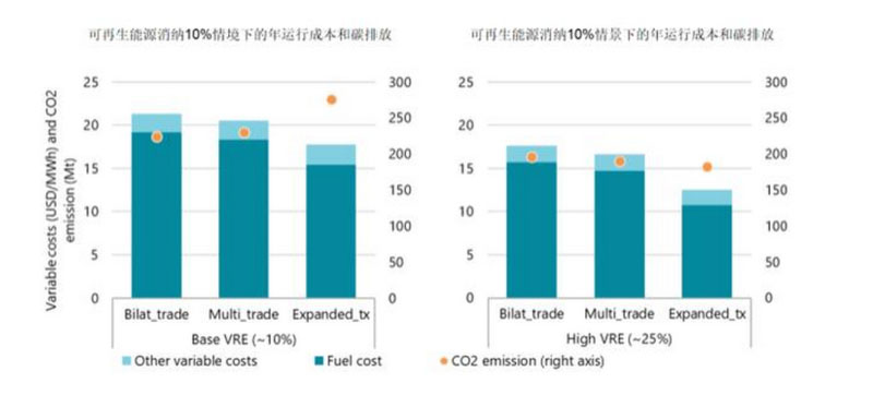 增加可再生能源消納比例可釋放互聯(lián)線路和多邊電力貿(mào)易的優(yōu)勢。借助跨境互連,更高比例的可再生能源將被消納,從而降低了成本和二氧化碳排放。