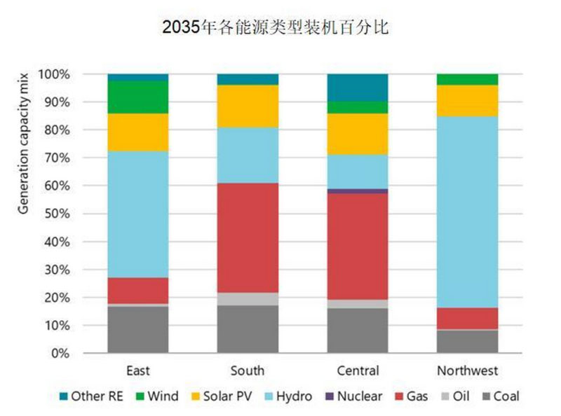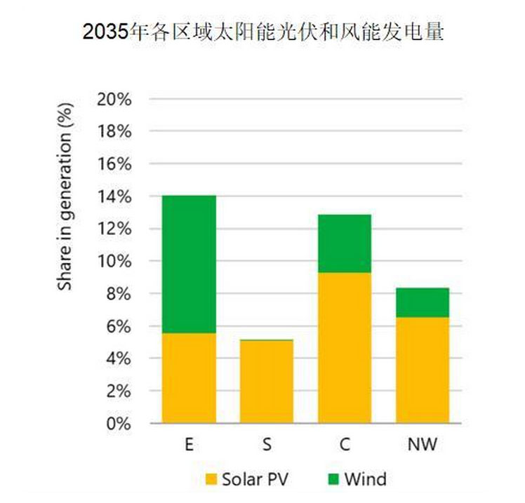 2035年各區(qū)域太陽能光伏和風電裝機將達到10%至20%。在積極情景的條件下,2035年,東部、南部、中部、西北部太陽能光伏和風電裝機將達到約25%、15%、20%、15%。