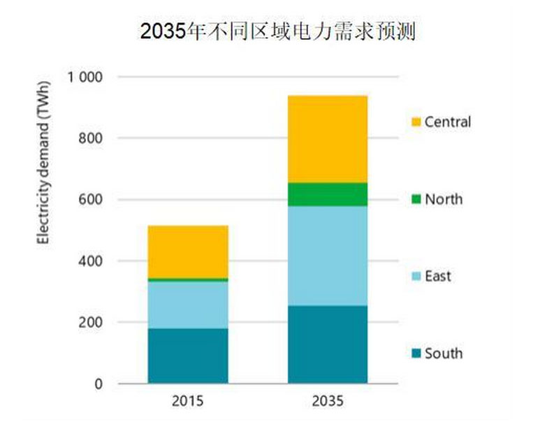 2015至2035年期間電力需求快速增長。在積極情景的條件下(基于東盟能源中心于2016年發(fā)布的第五版《東盟能源展望》),2035年,東盟電力需求預計較2015年將增長80%。東部區(qū)域增速較快,至2035年時電力需求最大,平均負荷水平最高。西北部區(qū)域需求最小,負荷水平最低。各區(qū)域電力需求均有較快增長。