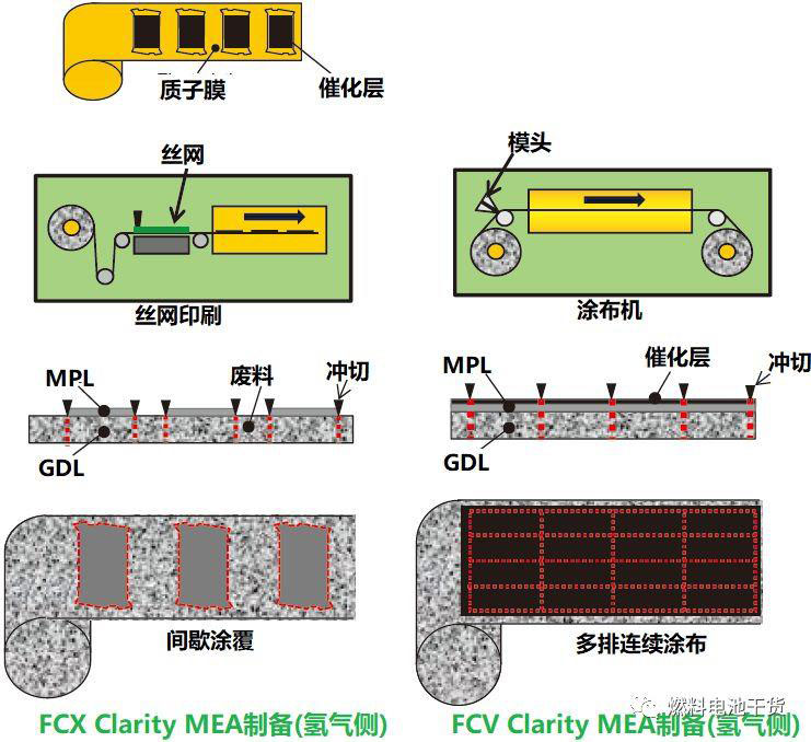 2008款FCX Clarity燃料電池膜電極制備技術(shù)主要包括基底層上微孔層涂覆技術(shù)和質(zhì)子膜上催化層涂覆技術(shù)。如前所述,2008款燃料電池膜電極中催化層為矩形,質(zhì)子膜和氣體擴(kuò)散層為不規(guī)則矩形狀。由于發(fā)電區(qū)限于催化層,導(dǎo)致質(zhì)子膜和氣體擴(kuò)散層面積利用率較低。在新一代FCV Clarity燃料電池中,膜電極外圍設(shè)立了樹脂邊框,發(fā)電區(qū)域形狀規(guī)則化。發(fā)電區(qū)域形狀矩形化后可使微孔層和催化層在卷狀擴(kuò)散層上涂覆形成,之后采用多腔沖孔法將膜電極沖切下來(lái),從而實(shí)現(xiàn)高速連續(xù)生產(chǎn),如下圖所示。上述措施大大提高了材料利用率,在膜電極面積相同情況下,質(zhì)子膜和擴(kuò)散層使用量降低了40%,提高產(chǎn)量,降低成本。