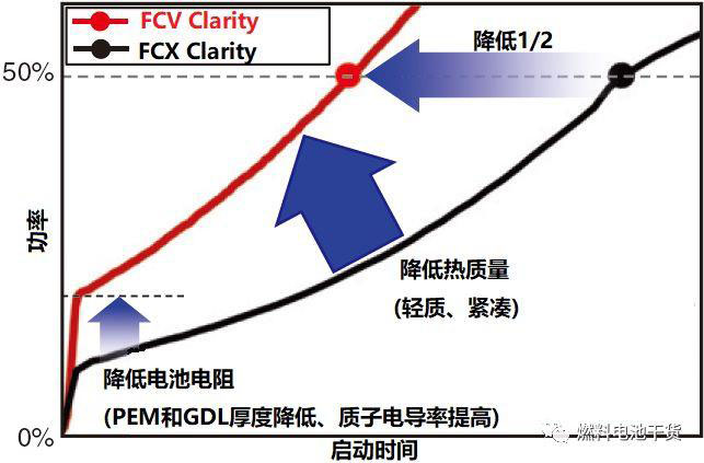FCX Clarity電堆在上一代的基礎(chǔ)上熱質(zhì)量降低了40%。熱質(zhì)量的降低來(lái)自于冷卻液體積的減少、雙極板片數(shù)的降低、單堆模塊中零部件數(shù)量的減少。在-20 ℃環(huán)境下,F(xiàn)CX Clarity電堆自啟動(dòng)至50%額定功率用時(shí)降低了3/4,并且具備自-30℃低溫環(huán)境啟動(dòng)能力。
