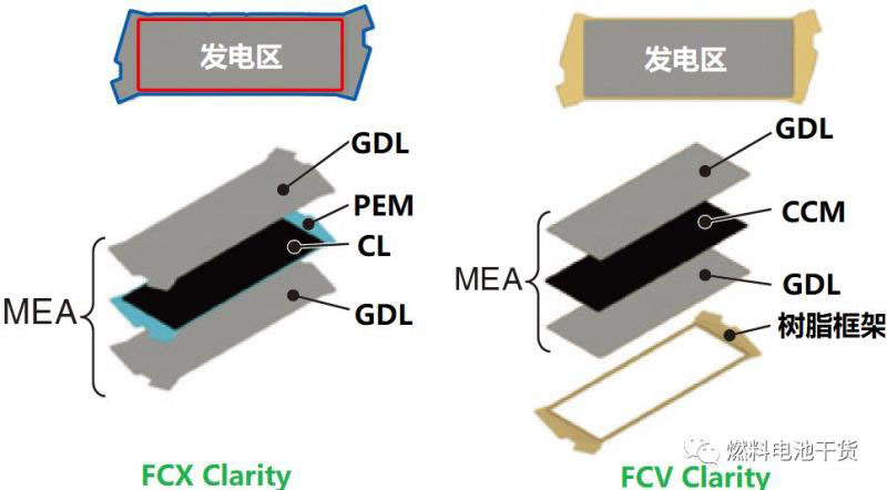 2016款FCV Clarity燃料電池對(duì)膜電極外圍的樹脂框架進(jìn)行重新設(shè)計(jì),并且與外圍樹脂框架接觸的極板保持平坦(無(wú)凹凸)。外圍樹脂框架部分設(shè)計(jì)出流槽,以給兩側(cè)分別導(dǎo)流氫氣和氧氣,保證電池表面氣體分布均勻。注意,F(xiàn)CX Clarity電池中,電極(催化層)為規(guī)則矩形狀,質(zhì)子膜和擴(kuò)散層為不規(guī)則形狀;FCV Clarity電池中,膜電極為規(guī)則矩形狀。