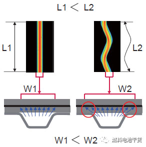 2008寬FCX Clarity電堆將氣體進(jìn)出方向垂直布置,電池發(fā)電表面短邊一分為二,實(shí)現(xiàn)了氣體在發(fā)電表面的均勻分布。此外,冷卻液水平走向,與氣體走向相交,實(shí)現(xiàn)冷卻液均勻分配發(fā)電表面。相比于直流道,在直線距離相等情況下,波紋形狀流道沿氣體方向長(zhǎng)度大于直流道,蜿蜒流道改變氣體姿態(tài),提高氣體傳質(zhì)特性。相比直流道,由于波紋形有效利用了電池發(fā)電表面,輸出性能可以提升約10%。