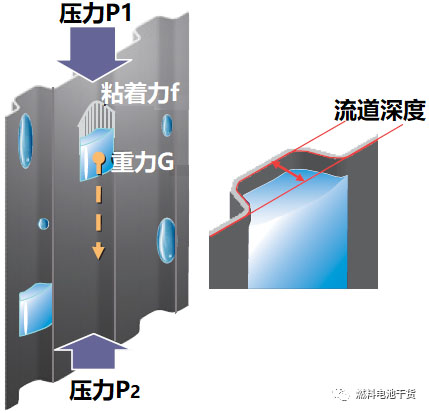 為開發(fā)高功率密度電堆,有必要降低氣場(chǎng)槽深來(lái)減少電池厚度。但降低氣體流道深度會(huì)提高流道中水的粘著力,引發(fā)水聚集甚至堵塞。氣體流道槽深h、附著力f和排水力F的關(guān)系可以用h=f/F公式表達(dá),其中,排水力F=P1-P1+G(參考下圖)。為在減少氣體流道深度的同時(shí)兼顧實(shí)現(xiàn)穩(wěn)定輸出性能,有必要將排水力F增加到因減小流道深度而水附著力增加相同的程度。 因此,本田汽車公司開發(fā)出了垂直進(jìn)氣電堆結(jié)構(gòu),即氫氣和空氣垂直從頂端進(jìn)入、底部出堆。