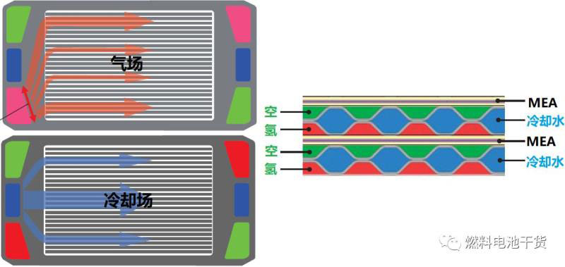 2008款FCX Clarity燃料電池電池采用“兩單元一冷卻層”結(jié)構(gòu),即膜電極兩側(cè)陰陽(yáng)極板的兩個(gè)背面,一背面為氣場(chǎng),另一背面為冷卻液場(chǎng),如下圖所示。相比上一代2004款FCX,F(xiàn)CX Clarity電堆每片單電池的冷卻層減少一半,每?jī)善る姌O所需的極板數(shù)量從4減到3,使得電堆厚度降低達(dá)20%(體積功率密度提升50%),電堆質(zhì)量降低達(dá)30%(質(zhì)量功率密度提升67%)。