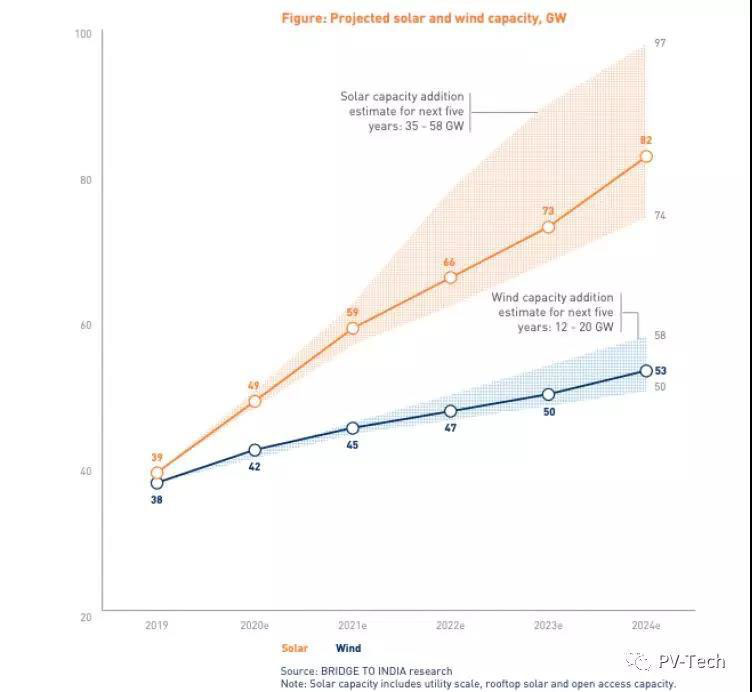 咨詢(xún)公司印度之橋的最新報(bào)告顯示,如果印度的政策環(huán)境能夠在很大程度上維持現(xiàn)狀,那么至2024年年底,印度的太陽(yáng)能和風(fēng)電項(xiàng)目裝機(jī)量預(yù)計(jì)會(huì)分別達(dá)到82GW和53GW。