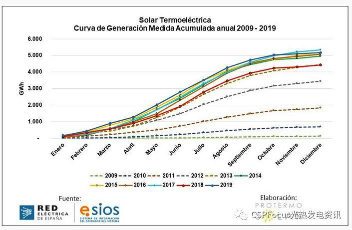 西班牙2009-2019十年間各年度1-12月光熱發(fā)電項(xiàng)目累計發(fā)電量趨勢統(tǒng)計表