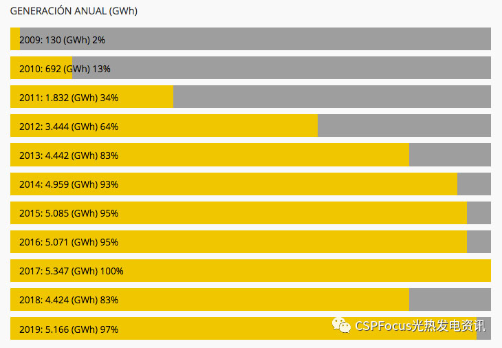 西班牙2009-2019十年間光熱發(fā)電項(xiàng)目年度累計發(fā)電量統(tǒng)計表