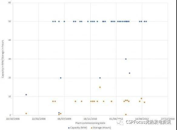 *藍(lán)點(diǎn)表示裝機(jī)容量,大多為50MW;黃點(diǎn)表示儲熱時長,大多為7小時