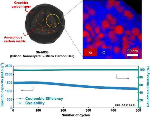 而KIST的新技術(shù)則有所不同。Hun-Gi Jung博士及其同事首先將紅薯衍生的淀粉溶解在水中,將硅溶解于玉米衍生的油中,然后將兩種溶液混合并加熱。結(jié)果是形成了碳-硅復合材料,其中微小的碳球阻止了硅溶脹。據(jù)悉,當測試時,發(fā)現(xiàn)由復合材料制成的陽極的存儲容量是類似石墨陽極的四倍,但在500次充電/放電循環(huán)中它們?nèi)员3址€(wěn)定。此外,利用新陽極的電池可在短短五分鐘內(nèi)充滿電至其全部容量的80%。