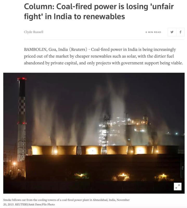 據(jù)路透社報(bào)道,印度的燃煤發(fā)電越來(lái)越被太陽(yáng)能等更便宜的可再生能源擠出市場(chǎng),印度的煤炭行業(yè)處于困境之中。印度煤電遇到的問(wèn)題原因主要是經(jīng)濟(jì)上的,而不是政策上的??稍偕茉纯稍谫?gòu)電協(xié)議中以每千瓦時(shí)3盧比(4.2美分)的價(jià)格提供,而現(xiàn)有的在運(yùn)煤炭廠發(fā)電量以每千瓦時(shí)4盧比的價(jià)格提供,而新建煤電廠的價(jià)格在每千瓦時(shí)5至6盧比之間。