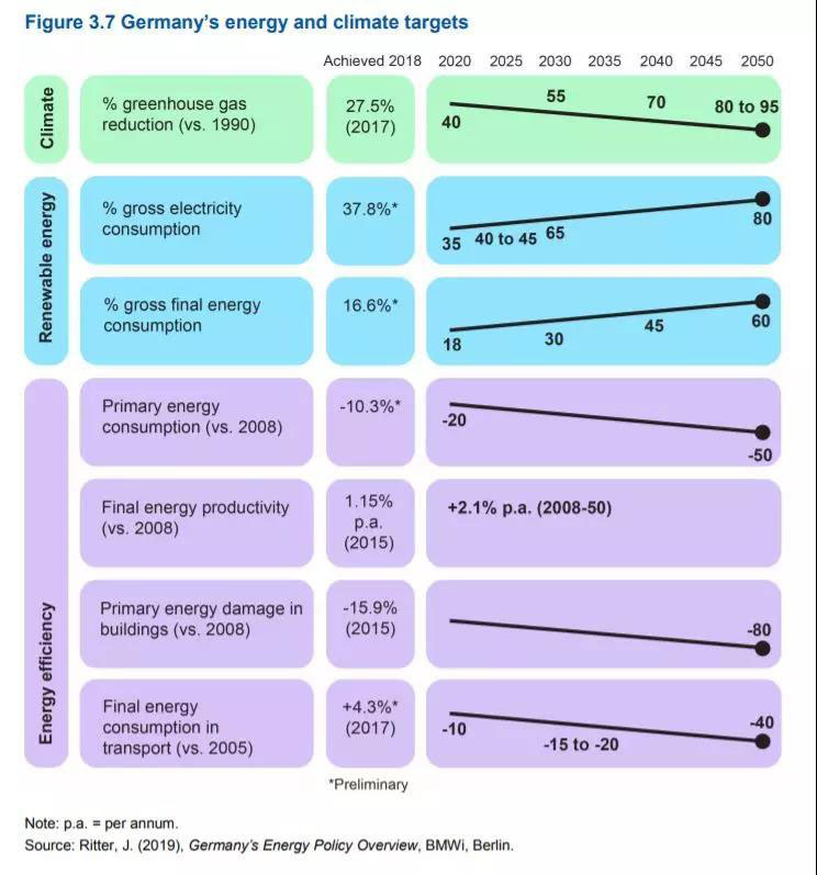 國際能源署發(fā)布德國能源政策評估報告,其中匯總了德國能源轉(zhuǎn)型各項目標的進展數(shù)據(jù):