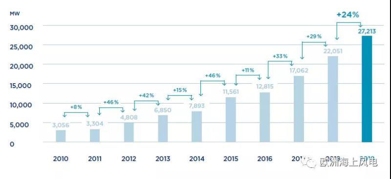 截至2019年底,全球海上風(fēng)電累計(jì)裝機(jī)容量27.2GW,比2018年底的數(shù)字增長了24%。