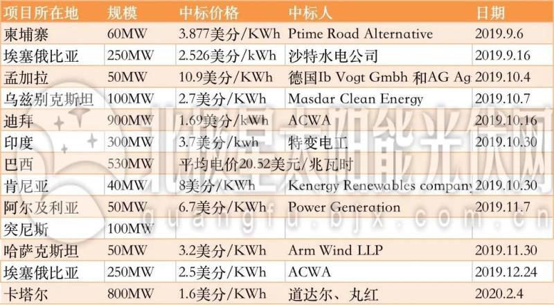 在全球平價(jià)上網(wǎng)進(jìn)程不斷加快的前提下,光伏電站中標(biāo)價(jià)格也在屢創(chuàng)新低,結(jié)合2019年以來的中標(biāo)情況來看,非洲,亞洲,南美洲等太陽(yáng)能資源豐富的地區(qū),正在不斷刷新太陽(yáng)能中標(biāo)價(jià)格,部分地區(qū)太陽(yáng)能已成為所有新建電源中電價(jià)最低的電源。