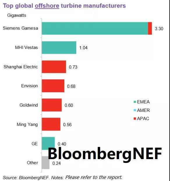 中國海上風(fēng)電市場的快速崛起使得上海電氣,遠景能源,金風(fēng)科技,明陽智慧能源分別位列第三到第六。