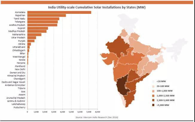 在2019年,卡納塔克邦是太陽(yáng)能裝置的最高的州邦,其次是拉賈斯坦邦和泰米爾納德邦??{塔克邦在2019年占太陽(yáng)能總裝機(jī)容量的29%??{塔克邦,拉賈斯坦邦和泰米爾納德邦在2019年總計(jì)貢獻(xiàn)了約70%的太陽(yáng)能安裝量。